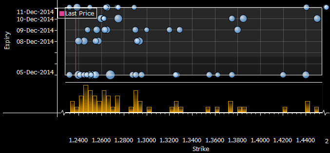 Call. На представленной ниже диаграмме отмечены опционы Евро call Доллар put (круги голубого цвета), экспирация которых наступает в течение недели. На диаграмме отображены лишь опционы call свыше 100 млн. евро. Сегодня 5 декабря наиболее крупный по объему call (985.8 млн. евро) истекает со страйком 1.2680. В области текущих уровней, представляющих наибольший интерес, самый крупный экспирирующийся call (661.3 млн. евро) имеет страйк 1.2400. Также из общей группы можно выделить экспирацию call со страйком 1.2550 (414.36 млн. евро). Данные Depository Trust & Clearing Corporation.