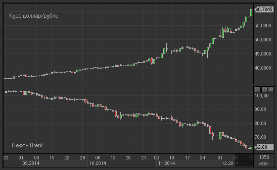 Начало новой торговой недели ознаменовано новыми рекордами курса российской валюты по отношению к доллару США и евро. Курс доллар/рубль сформировал абсолютный исторический максимум 61.25, несмотря на очередную интервенцию Центрального банка России, который сегодня, пытаясь стабилизировать падение национальной валюты, продал приблизительно 350 млн. долларов (согласно информации BCS Financial Group). Помимо вины в темпах падения рубля валютных спекулянтов, которые подкрепляют свои действия циркулирующими на рынке слухами о том, что на стороне продавцов российской валюты под «спекулятивной мантией» стоят, в том числе, и гос. корпорации, существенную долю в основном тренде занимает отток иностранного капитала. «В значительной степени это внешний отток капитала, вызванный пересмотром долгосрочных перспектив России. Формирование ценообразования происходит с учетом продолжительного периода низких цен на нефть. В этих условиях Россия не выглядит местом, куда следует вкладывать деньги. Даже без всяких санкций», - говорит Дмитий Дудкин, глава дирекции анализа долговых инструментов из Уралсиб Кэпитал. Что касается «слухов за кулисами», то речь идет об опасениях, что часть денег из 625 млрд рублей, которые получила НК Роснефть по факту размещения 14 выпусков облигаций, которые за час были выкуплены неназванными покупателями, попадут на валютный рынок и будут оказывать дополнительное давление на «итак избитый со всех сторон» рубль.