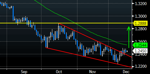 В прошлую среду евро/доллар закрылся выше верхней границы дневного клина, затем протестировал пробитое сопротивление и с тех пор пытается продолжить рост. Пока техническая картина в паре выглядит классическим окончанием даунтренда с формированием нисходящего треугольника в рамках пятой волны даунтренда и последующим выходом из него наверх. После этого часто наблюдается резкий рост, и в данном случае, на наш взгляд, неплохой целью является максимум 15 октября (вершина четвертой (коррекционной) волны) $1.2888, представляющий собой примерно уровень коррекции 38.2% от снижения с майских максимумов. Впрочем, для этого евро/доллару необходимо вначале закрыться выше 55-дневной МА ($1.2552), чего не происходило с 8 мая. Мы считаем, что пара, возможно, уже установила годовой минимум и теперь готова к развитию классической трехволновой коррекции A-B-C. Источник: ProFinance.Ru - Новости рынка Forex