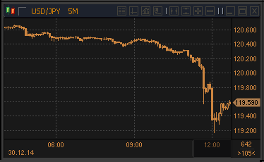 Доллар/иена совершил резкий прорыв ниже Y120.00 в условиях очень тонкого предпразничного рынка, что традиционно свойственно для периода между католическим Рождеством и Новым годом. Доллар пребывает под общим давлением, так как спекулянты урезают уровень плеча после продолжительного ралли гринбека во второй половине 2014. Курс прижался к расширенным минимумам Y119.59 во время первой волны продаж, после чего отскочил выше Y119.80, а в настоящее время наблюдается вторая волна которая отбросила пару на Y119.19. Дилеры говорят, что тонкие рынки обеспечивают условия для таких резких движений перед 3-дневным перерывом в работе рынков в Японии, тем более, что доллар/иена показал одно из впечатляющих ралли в уходящем году, а истечение календарного года требует корректировки балансов. Трейдеры также знают, что Y120.00 содержит очень большой опцион, который истекает сегодня в Нью-Йорке ($ 5.13 миллиарда), что, как ожидается, привлечет внимание игроков к экспирации. Продажи евро/иены рассматриваются как основной драйвер роста иены – кросс сломал Y146.00 при открытии европейских торгов, упал к Y145.10, а в настоящее время торгуется около Y145.50. Поддержка в доллар/иене видна на Y119.20 и на Y119.00, но более сильная поддержка отмечена позади, на Y118.80. Фунт и евро также отреагировали на внезапный приступ слабости доллара к иене. Фунт пробил более ранние максимумы Азии $1.5522 и сопротивление на $1.5533. Евро/доллар, который ранее обновил минимум года на $1.2126 и протестировал 10-летнюю линию восходящего тренда, отскочил к $1.2185. Отскоку также способствовала небольшая перепроданность на часовых осцилляторах. Тестирование зоны сопротивления $1.2185-95 обеспечит теперь понимание дальнейшего направления движения. Область $1.2189-1.2204 представляет собой 50% -61,8% от движения $1.2253-1.2124. Прорыв выше $1.2216 создаст какой-то реальный шанс на коррекцию. Если мы развернем отсюда вниз и направимся вновь тестировать восходящую линию поддержки на $1.2114, то в случае удачи уйдем в диапазон $1.2090- $1.2054.