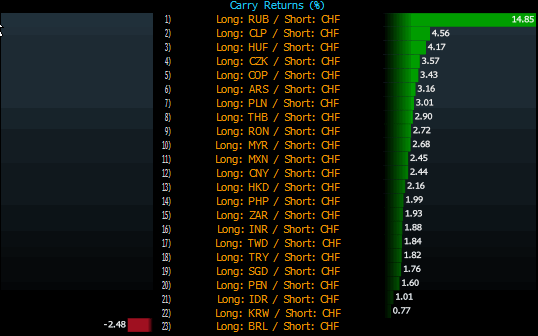 В представленной ниже таблице собрана доходность от carry trade, которую можно было бы получить за последний месяц, используя в качестве валюты финансирования швейцарский франк. Как видно, те инвесторы, которые обладали достаточным запасом храбрости, безумия или же свободных денежных средств, могли за месяц заработать более 14%, если бы заняли швейцарский франк, конвертировали его в российский рубль и купили российские активы. Заработать без учета налогов 1.4 млн. франков с вложенных 10 млн. франков за месяц – крайне привлекательно, если Вы любите ходить по канату, натянутому между крышами двух небоскребов, без страховки. Источник: ProFinance.Ru - Новости рынка Forex