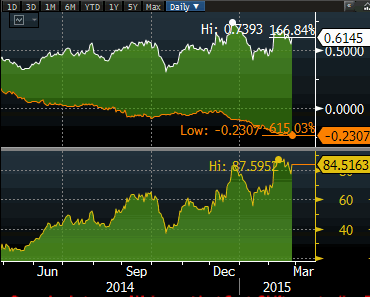 В то время как Джанет Йеллен просигнализировала о том, что ФРС не спешит повышать ставки, чтобы не подорвать рост американской экономики и процесс улучшения на рынке труда, американская валюта сохраняет расположение инвесторов. Валютные стратеги Goldman Sachs отмечают, что это обусловлено опережающим - относительно других стран G10 - характером экономического цикла в США. Таковой позволяет рассчитывать на сохранение конструктивной для американской валюты динамики спрэдов доходностей (прим. Pro Finance Service: ниже на графике представлены доходности двухлетних американских и немецких облигаций), и в GS считают, что у доллара есть потенциал для дальнейшего внушительного роста даже после недавнего ралли. В банке сообщают о снижении прогнозов по евро/доллару: трехмесячный был пересмотрен с $1.14 до $1.12, а шестимесячный - с $1.11 до $1.10, тогда как двенадцатимесячный был оставлен на уровне $1.08. В GS отмечают, что дополнительный повод ожидать более активного снижения евро/доллара дает ситуация с Грецией, при этом в банке ожидают роста американской валюты даже при достижении соглашения с Еврогруппой - таковое будет лишь временной мерой и не сможет стать решением проблем экономического роста в периферийных странах Еврозоны.