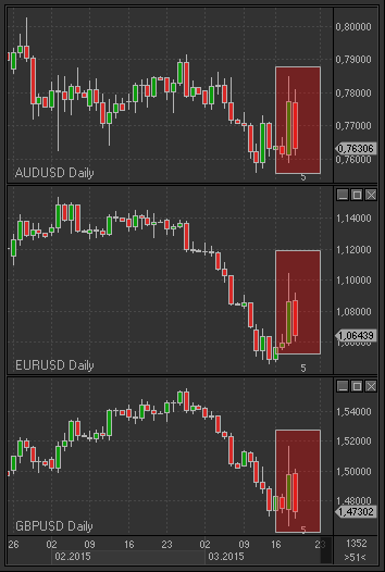 Рыночная ситуация по итогам двух торговых дней – среды (18 марта) и четверга (19 марта), показалась нам достойной отдельных комментариев. Динамику валютных курсов в среду в качестве реакции на заседание Комитета по операциям на открытом рынке ФРС США (FOMC), а затем в четверг, диктовали разные категории рыночных участников.