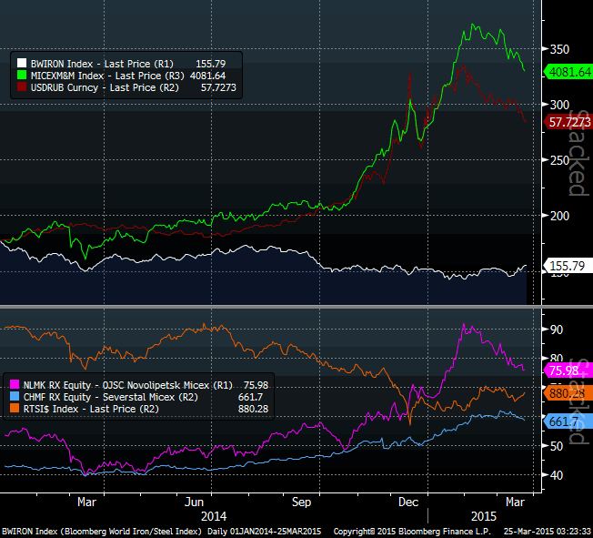 На фоне рисков замедления мировой экономики падение российского фондового рынка в качестве ключевых драйверов имело под собой: введенные против страны международные санкции, снижение цен на нефть, отток капитала иностранных инвесторов, 46%-ое падение курса рубля. Однако российские металлургические компании в этой среде оказались в привилегированной позиции, поскольку они имеют рублевые производственные затраты и высокую долю продаж своей продукции на зарубежных рынках. Теперь же, когда рубль с конца января довольно высокими темпами отыгрывает потери предыдущего года, для российских сталепроизводителей этот факт выступает риском снижения рентабельности. Цены на внутреннем рынке довольно высоки. Ожидать их роста за счет резкого увеличения спроса в обозримом будущем не приходится. Наоборот, если укрепление рубля продолжится, цены на внутреннем рынке должны быть снижены по факту снижения премии за «валютный риск».