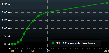 - Наша модель оценки стоимости облигаций показывает, что справедливая доходность в настоящее время должна составлять приблизительно 2.9% и должна расти с течением времени. Наш анализ кривых доходности с учетом макроэкономических ожиданий и разных временных горизонтов показывает, что участок кривой доходности между «пятилетками» и «десятилетками» является слишком плоским, что формирует более выгодную возможность для коротких позиций в 10-летних облигациях, нежели в 5-летних или же в 30 летних бумагах.