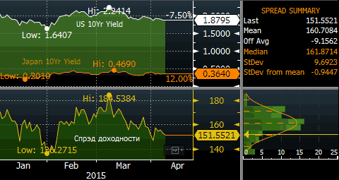 Свою лепту в динамику казначейских облигаций вносит неопределенность с началом цикла повышения процентных ставок ФРС. Слабые цифры в опубликованном на прошлой неделе отчете по рынку труда в США за март привели к падению доходности 10-летних «трежерис» до 1.8%. Рынку пришлось пересмотреть в очередной раз отодвинуть свои ожидания первого шага ФРС в направлении ужесточения денежно-кредитной политики. Глава ФРБ Миннеаполиса Нараяна Кочерлакота во вторник в своих комментариях отметил, что «федеральным чиновникам следует проявить экстраординарную сдержанность в отношении ухода от аккомодационной монетарной политики», добавив, что повышение ставки в текущем году было бы ошибкой.