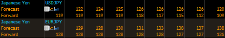 Текущие рыночные ожидания, которые представлены в таблице, отражают экспертные прогнозы в отношении японской валюты. Это средние ожидания, составленные агентством Bloomberg, на основании прогнозов крупнейших банков и титулованных инвестиционны компаний. Наша модель показывает, что данные прогнозы выглядят критически завышенными в сложившихся условиях. Глобальная консолидированная картина валютных курсов, товарных рынков и инструментов с фиксированной доходностью в настоящий момент отражает, что иена «сильно отстала от паровоза».