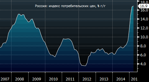 Но если мы посмотрим на динамику индекса потребительских цен, то по итогам марта рост потребительской инфляции в годовом исчислении составил 16.9%. По прогнозам Миниэкономразвития России инфляция должна к сентябрю снизиться до 12/13%, однако очевидно, что это крайне оптимистичный сценарий, фактическое осуществление которого в обозначенные сроки выглядит маловероятным.