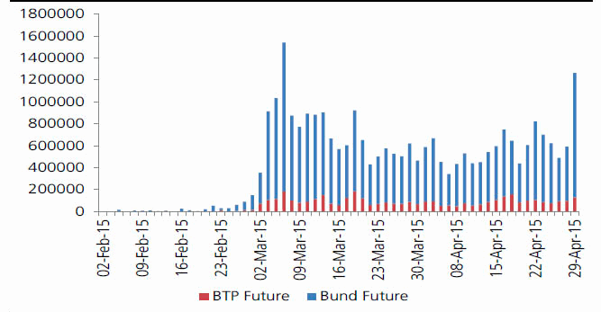 Ежедневный объем контрактов на фьючерсы BTP и фьючерсы на немецкие гос. облигации (июньский контракт)