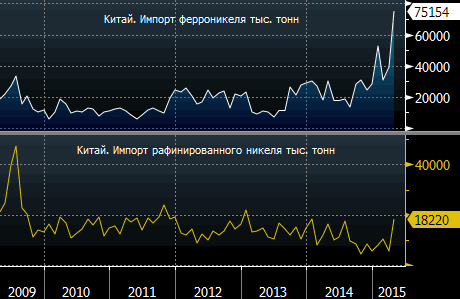 Согласно данным Генеральной Администрации таможни Китая, импорт рафинированного никеля достиг 15 месячного максимума. Ферроникелевые поставки также достигли рекордных высот на фоне замедления внутреннего производства. Импорт используемого в производстве нержавеющей стали рафинированного никеля в апреле вырос на 12% по сравнению с аналогичным периодом годом ранее и составил 18 200 метрических тонн, что является самым высоким значением с января 2014 года. Импорт ферроникеля увеличился более чем двукратно и составил 75 154 тонны. Данные показыают, что спрос крупнейшего игрока на рынке металлов, коим является Китай, вновь развернулся в сторону зарубежных поставок, поскольку внутреннее производство падает. По мнению экспертов из Australia & New Zealand Banking Group, это является признаком того, глобальное производство никеля сокращается, а спрос и цены будут расти.
