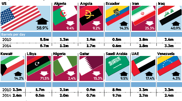Объем добычи нефти (изменение в % в период с 2010 по 2014 годы)