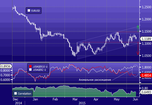 Теперь обратим внимание на представленный график, где отображена динамика спрэда доходности между 2-летними нотами США и Германии (USAGER2 – белая линия) и 10-летними облигациями США и Германии (USAGER10 красная линия). Изменение ситуации на коротком и длинном концах кривой доходности привело к существенному расширению в обсуждаемых спрэдах (на графике обозначено, как аномальное расхождение). Динамика спрэда доходности облигаций США/Германии и курса евро/доллар имеет обратную зависимость (в нормальных условиях, когда спрэд доходности падает — евро/доллар растет и наоборот). Как видим, динамика спрэда 2-летних облигаций США/Германия не подтверждает в июне восходящую динамику евро/доллара, что и привело к аномальному расхождению.