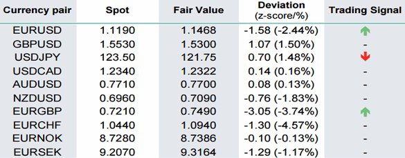 Валютные стратеги BNP Paribas обновили свою еженедельную оценку ситуации на валютном рынке, в подготовке которой используется квантовая модель «STEER», успешно зарекомендовавшая себя с точки зрения реализации своих прогнозов. Напомним, что данный банк является «пионером» использования данного подхода к оценке краткосрочной справедливой стоимости валютных курсов. Основу данной методики представляет взаимосвязь между процентными ставками, стоимостью акций и цен на сырьевые товары. Ниже приведена таблица с указанием валютной пары, ее текущего курса, «справедливой» цены, дельты между двумя предыдущими параметрами и сигналом на покупку/продажу. Отметим, что главным выводом из приведенных ниже цифр является глобальная перепроданность евро, особенно против франка, фунта и доллара. Источник: ProFinance.Ru - Новости рынка Forex