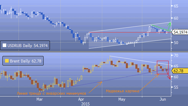 На графике зеленым цветом отражена краткосрочная линия сопротивления с июньских максимумов. Ее пробитие в совокупности с медвежьей картиной на нефть является сигналом к покупке доллара против рубля с целью на 58.00. Федрезерв может способствовать изменению текущей картины. Но если ситуация сохранится, то котировки Brent направляются в область 57/56 долларов за баррель. Источник: ProFinance.Ru - Новости рынка Forex