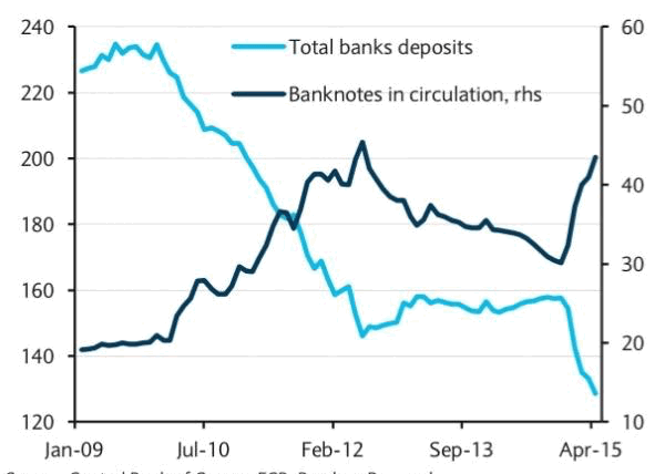Значительная часть вкладов связана со снятием наличных денежных средств, их использование с конца прошлого года существенно выросло (+44%). То есть, 29 млрд. евро, снятых с банковских вкладов с ноября 2014 года по апрель 2015 года, увеличили объем физической денежной массы в обращении на 13 млрд. евро.