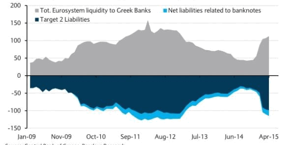 Количество банкнот, превышающих квоту для Греции 9около 27 млрд. евро) представляет собой обязательство центрального банка Греции перед остальными участниками Евросистемы, сверх чистых обязательств связанных с транзакциями с другими центральными банками Евросистемы (обязательства Target2). По состоянию на конец апреля, чистые обязательства, связанные с распределением банкнот евро, составляли 16.2 млрд. евро, а баланс Target 2 ушел в минус примерно на 99 млрд. евро. Таким образом, общие риски Евросистемы в Греции составили около 115 млрд. евро. Это соответствует сумме займов в рамках ликвидности Евросистемы (OMO + ELA). Если принять увеличение верхнего лимита ELA за признак оттока депозитов /использования банкнот и увеличения финансирования в рамках Евросистемы, такие риски возрастают до 125 млрд. евро.