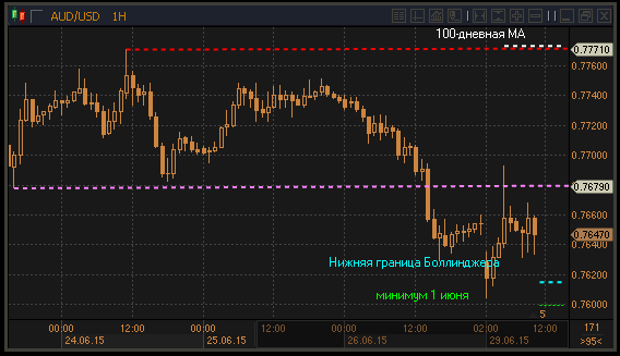 Комментарий: 55-дневное скользящее среднее значение ограничило пару в начале прошлой недели, а 100-дневное скользящее среднее – в оставшуюся часть недели. В результате, случилась распродажа в пятницу. Теперь пара направляется к области $0.7533-52, где находятся минимумы 2015. Основание Боллинджера является ключевой проблемой для медведей, и, как ожидается, ограничит падение на нынешнем этапе. Слои сопротивления остаются все там же, и быкам необходимо закрытие выше $0.7849, максимума июня, чтобы перечеркнуть медвежьи надежды и обозначить цели в районе $0.8063-0.8165. Источник: ProFinance.Ru - Новости рынка Forex