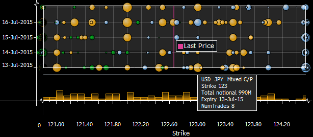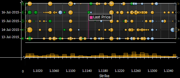 | Как пользоваться графической информацией, представленной ниже? На графиках в виде кругов, размер которых зависит от объема, представлены страйки опционов (по оси Х), сроком истечения которых наступает в указанную дату (ось Y). В целях наглядности графически обозначены лишь те опционные контракты, объем которых выше 20 млн. Голубой цвет — Call. Зеленый цвет — Put. Желтый цвет — Mixed C/P. Источник данных: Депозитарная Трастовая и Клиринговая Корпорация (DTCC). Просьба свои замечания и пожелания относительно формата и содержания предоставляемой на сайте аналитической информации направлять по адресу: analytics@forexpf.ru |