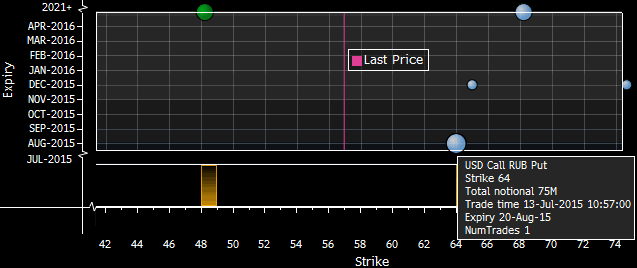 Доллар/рубль Скорее всего два выше обозначенных опциона являются реализацией стратегии одного инвестора «короткий стрэнгл». Инвестор рассчитывает заработать на премии от проданных двух обозначенных выше контрактов, подразумевая, что курс доллар/рубль к дате экспирации не покинет диапазон цен между страйками. Сделка от 13 июля, 13:57 — Европейский ванильный опцион USDRUB Call Страйк: 64.000 Объем: $75 млн. Премия: $320 250. Экспирация: 520 августа 2015 Евро/рубль 2. |