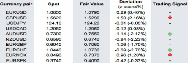 Валютные стратеги BNP Paribas обновили свою еженедельную оценку ситуации на валютном рынке, в подготовке которой используется квантовая модель «STEER», успешно зарекомендовавшая себя с точки зрения реализации своих прогнозов. Напомним, что данный банк является «пионером» использования данного подхода к оценке краткосрочной справедливой стоимости валютных курсов. Основу данной методики представляет взаимосвязь между процентными ставками, стоимостью акций и цен на сырьевые товары. Ниже приведена таблица с указанием валютной пары, ее текущего курса, «справедливой» цены, дельты между двумя предыдущими параметрами и сигналом на покупку/продажу.