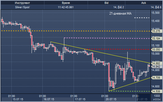 Комментарий:: исходя из неудач перед 21-дневным скользящим средним значением в последние недели, серебро остается тяжелым, а свежие минимумы 2015, достигнутые в понедельник, подтверждают смещение баланса сил в пользу медведей, что усиливает аргументы в плане дальнейшего движения вниз, и целями теперь выступают месячные минимумы августа 2009. Слои сопротивления продолжают накапливаться, и быкам в настоящее время необходимо закрытие выше $15.056, чтобы подтвердить ослабление медвежьего давления. Источник: ProFinance.Ru - Новости рынка Forex