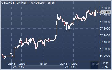 Рубль довольно долгое время стоял в диапазон, сказывалось летнее затишье. И, видимо, игроки несколько подустали от этого "болота" и вчера решили раскачать рынок. Вечером произошел резкий прорыв наверх из затяжного бычьего треугольника. Довольно редкое явление для вечерней сессии — на срочном рынке котировки рубля рванули вниз, поводом к чему послужило падение нефтяных цен в реакции на вышедшие в Штатах данные по запасам сырья. Рынок нефти практически продолжает двигаться в медвежьем русле: падение за последние 6 недель составило почти 20%. Последним поводом для продаж послужили также и слова замминистра нефти Ирана Амир-Хоссейн Заманиния, что в течение одного года после снятия санкций на рынок поступит дополнительно 1 млн баррелей в сутки.