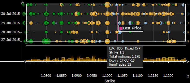 | Как пользоваться графической информацией, представленной ниже? На графиках в виде кругов, размер которых зависит от объема, представлены страйки опционов (по оси Х), сроком истечения которых наступает в указанную дату (ось Y). В целях наглядности графически обозначены лишь те опционные контракты, объем которых выше 20 млн. Голубой цвет — Call. Зеленый цвет — Put. Желтый цвет — Mixed C/P. Источник данных: Депозитарная Трастовая и Клиринговая Корпорация (DTCC). Просьба свои замечания и пожелания относительно формата и содержания предоставляемой на сайте аналитической информации направлять по адресу: analytics@forexpf.ru |