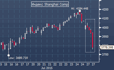 Крайне негативное отношению к риску является определяющим для динамики валютных курсов параметром в настоящий момент. Торговая неделя начинается на минорной ноте — с падения китайского фондового рынка. Индекс Shanghai Composite к настоящему моменту рухнул на 7.5%. Бегство инвесторов в противоположную сторону от рисковых активов, в первую очередь, оказывает существенную поддержку японской иене. Также к доллару прибавлет в цене евро, который в последнее время активно используется в качестве валюты финансирования. Сокращение рисковых позиций заставляет выкупать евро обратно, что и приводит к его укреплению в такие моменты.