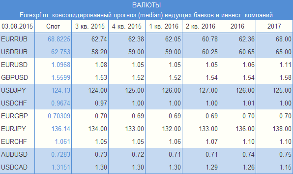 Bank of Tokyo Mitsubishi (31 июля): 3кв.2015 – 64.95; 4кв.2015 – 69.00; 1кв.2016 – 65.68; 2кв.2016 – 61.00