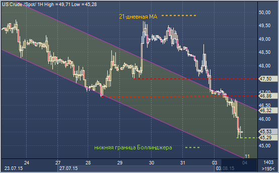 Комментарий:: восстановление с последних минимумов 2015 (U15) споткнулось о зону сопротивления $50.08-51.58, в результате мы ушли на новые минимумы 2015 года (U15) и 5-месячные минимумы. Медведи по-прежнему твердо сосредоточены на области $43.58-44.03. Прорыв выше $46.68 необходим для облегчения понижательного давления и намека на отскок назад к области $49.63-51.58. Перепроданность дневных осцилляторов и нижняя граница Боллинджера являются ключевыми проблемами для медведей. Источник: ProFinance.Ru - Новости рынка Forex