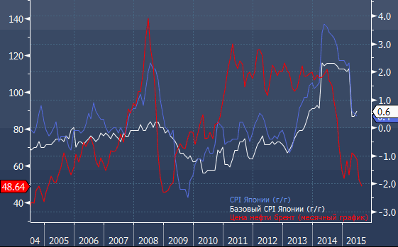 Снижение затрат на энергоносители и текущий курс иены весьма благоприятно сказываются на финансовых результатах японских корпораций, но динамика инфляции не дает повода для оптимизма.Инфляционные прогнозы Банка Японии базировались на ценах на нефть более чем на $15 выше текущих, и среди участников рынка стал заметен рост ожиданий дополнительных мер со стороны центробанка. Между тем, по мнению старшего экономиста NLI Research Institute Тсуёши Уено, куда большим поводом для беспокойства Банка Японии является то, что стоит за падением цен на сырье — замедление экономики Китая.