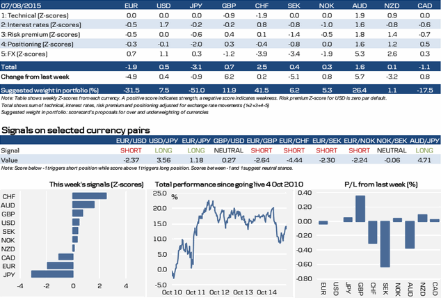 На этой неделе наша торговая система G10 FX Financial Scorecard рекомендует к покупке швейцарский франк, аусси и фунт, а к продаже иену, евро и луни (вес в общем портфеле указан в таблице ниже). Сгенерированные на прошлой неделе сигналы привели к убытку в размере 0.8%. Наименее удачной оказалась покупка шведской кроны, а короткая позиция в фунте принесла неплохую прибыль.