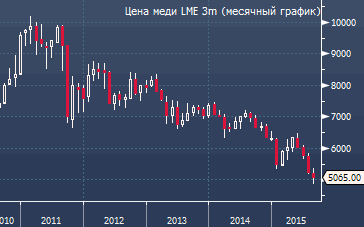 Рост опасений относительно роста развивающихся рынков, а точнее китайской экономики, лишь усугубил негативный настрой на рынке, который остается во власти медведей с 2012 года. Но что еще общего между нефтью и медью? Избыток предложения. Производство металла продолжило расти (+3.8% г/г) и в первом полугодии 2015 достигло 9.45 млн. тонн. В итоге, дисбаланс на рынке составил, по оценкам WBSC, 151 00 тонн — избыток предложения за весь 2014 год, тем временем, оценивается в 295 000 тон. Между тем, как и в случае с нефтедобывающими компаниями, падение цен стимулирует производителей оптимизировать издержки, и в отсутствие роста спроса приведение рынка к более сбалансированному состоянию займет время и, вероятно, потребует сохранения низких цен.