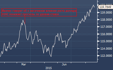 Курс американской валюты является одним из факторов, на которые обращает внимание ФРС, и его рост в марте нашел отклик в виде высказываний о потенциальном негативном эффекте укрепления доллара на инфляцию и экономическую активность. Индекс доллара в понедельник достиг минимальных уровней с января, однако привычный для инвесторов (прим. forexpf.ru: отражает динамику доллара против корзины основных валют - 57.6% евро, 13.6% иена, 11.9% фунт, 9.1% канадский доллар, 4.2% шведская крона, 3.6% франк), он не столь интересен регулятору. Индекс доллара ФРС, между тем, рассчитывается по отношению к корзине валют двадцати шести основных торговых партнеров США с учетом показателей объема торгового оборота, и его курс в прошлую среду достиг рекордного максимумам в 120 пунктов.В центре внимания в предстоящие дни будут высказывания чиновников ФРС, в том числе и в рамках встречи в Джексон-Хоул, а также довольно насыщенный значимыми отчетами из США экономический календарь. В отсутствие видимых мягких сигналов со стороны ФРС хорошие данные вполне могут поддержать ожидания повышения ставки, но ощутимой стабилизации на финансовых рынках пока не наблюдается, риски новых приступов паники сохраняются, и в целом перспективы развивающихся рынков выглядят не внушают большого оптимизма. Соответственно риски дальнейшей корректировки оценок будущего уровня ставок ФРС выглядят ощутимыми, и этот процесс может оказать негативное влияние на доллар.Конечно, последние данные из США в целом носят конструктивный характер, и глава ФРБ Нью-Йорка Уильям Дадли не лукавит, когда говорит, что «события в экономике развиваются довольно хорошо». Тем не менее, у ФРС есть повод для беспокойства — падение цен на энергоносители и сырье, и, учитывая последние события на финансовых рынках, девальвацию юаня и ряда других валют, руководство центробанка может предпочесть повременить с повышением ставки. Данные CME, впрочем, указывают на то, что еще не все утратили веру — исходя из фьючерсов на ставку по федеральным фондам вероятность ее повышения 17 сентября оценивается в 24% (прим. profinance.ru: кривая OIS предполагает вероятность такого события в 20%).