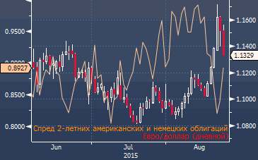 Заметное улучшение в динамике евро/доллара в последние дни сопровождалось весьма любопытными изменениями на рынке облигаций: спрос на фоне паники на рынках возрос, как на немецкие бумаги (двухлетние торгуются с премией), так и на американские, однако при этом спред между ними существенно сузился. В то время как это отчасти объясняется большей привлекательностью казначейских облигаций, динамика спредов доходности также отчасти отражает наметившиеся изменения в оценках политики ФРС - ряд участников рынка все больше сомневается, что повышение ставок произойдет в этом году.