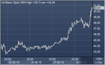 Цены на нефть продолжают сумасшедший взлет. Темпы роста рынка за неделю стали рекордными с 2011 года. Бурный взлет котировок обусловлен ускорением роста экономики США. Октябрьские фьючерсы на нефть Brent на лондонской бирже ICE Futures к 18.45 мск подорожали до $50.10 за баррель. Котировки фьючерсов на нефть WTI на октябрь на торгах Нью-йоркской товарной биржи (NYMEX) к указанному времени выросли до $45.07 за баррель. С начала недели WTI подорожала более чем на 11 %, Brent - на 10%. Данные о неожиданном падении запасов нефти в США по итогам предыдущей недели на 5,45 млн баррелей, данные о пересмотре оценки роста американской экономики во втором квартале с 2,3% до 3,7%, меры, предпринятые Китаем для успокоения рынков, слова Уильяма Дадли о возможной отсрочке повышения ставок ФРС — все это создало предпосылки для активного роста цен на сырье.