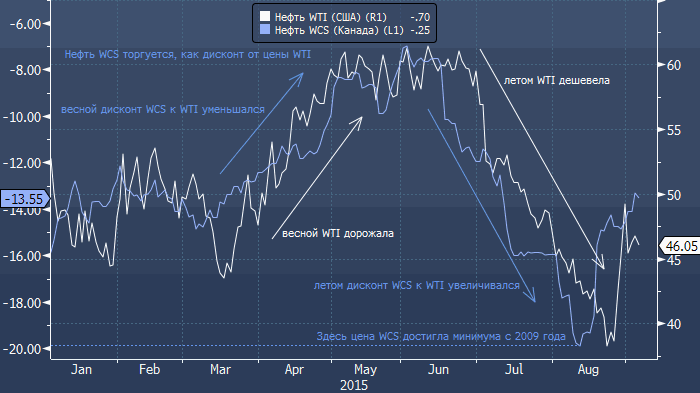 Во-первых, напоминаем, что в июльском отчете по монетарной политике Банк Канады звучал оптимистично в отношении цен на нефть. В частности, прогноз Центробанка подразумевал стоимость на уровне 60 долларов за баррель и значительное сужение спрэда между канадской нефтью (WCS - Western Canadian Select) и западно-техасской WTI.