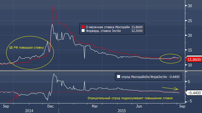 С аналитиками все более-менее понятно. А каковы ожидания рынка? Рыночные ставки не дают уверенного прогноза, но с начала августа по-прежнему продолжают намекать, что необходимо не снижение, а повышение ставки. Спрэд между 3-месячной ставкой кредитования Моспрайм и форвардными ставки 3мес/6мес. является отрицательным и составляет 44 базисных пункта или 0.44%. Таким образом, рынок намекает на ужесточение кредитных условий. Интересная ситуация…