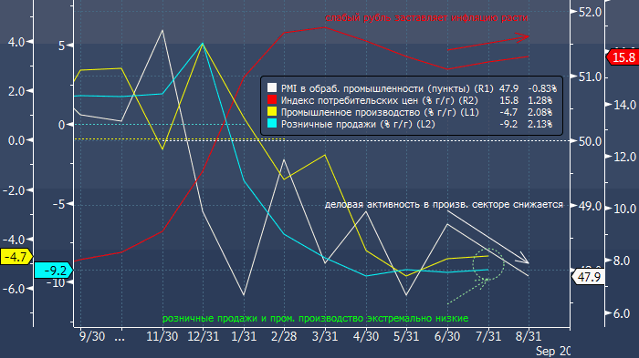 Увы за прошедшее с 31 июля время опубликованная статистика сообщает, что ситуация начинает выходить из под контроля. Так вышедшая в августе потребительская инфляция за июль, а также опубликованная в сентябре потребительская инфляция за август показывает возобновление восходящей динамики. Важно, что темпы роста инфляции в августе существенно возросли. Все-таки слабость рубля рушит ожидания ЦБ и заставляет цены увеличиваться. И в тоже время экономическая активность замедляется. Об этом сообщает индекс деловой активности PMI в производственной сфере, который, подчеркнем, относится к опережающим индикаторам. В июле и августе производственный PMI (индекс менеджеров по закупкам) все глубже и глубже уходил от порогового значения 50 пунктов, которое отделяет фазу роста деловой активности от замедления оной.