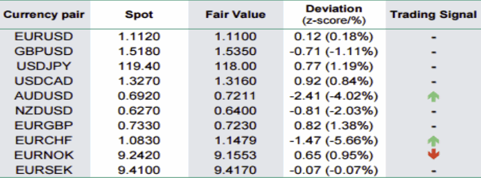 Валютные стратеги BNP Paribas обновили свою еженедельную оценку ситуации на валютном рынке, в подготовке которой используется квантовая модель «STEER», довольно успешно зарекомендовавшая себя с точки зрения точности своих прогнозов. Напомним, что данный банк является пионером использования данного подхода к оценке «справедливости» текущих валютных курсов. Основу данной методики представляет взаимосвязь между процентными ставками, стоимостью акций и цен на сырьевые товары. Ниже приведена таблица с указанием валютной пары, ее текущего курса, «справедливой» цены, дельты между двумя предыдущими параметрами и сигналом на покупку/продажу.