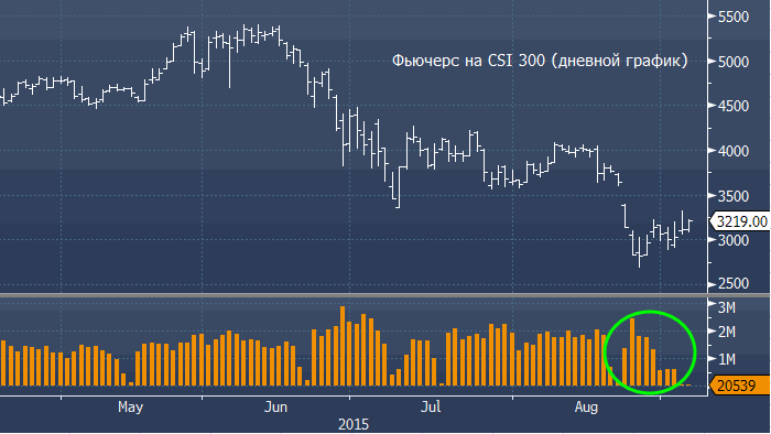 12:24 suny: после принятия Китаем ряда карательных мер (например, запрет на короткую продажу и арест лиц, причастных, по мнению китайских властей, к обвалу), направленных на стабилизацию фондового рынка, объем торгов фьючерсом на CSI 300 рухнул до трехлетнего минимума.