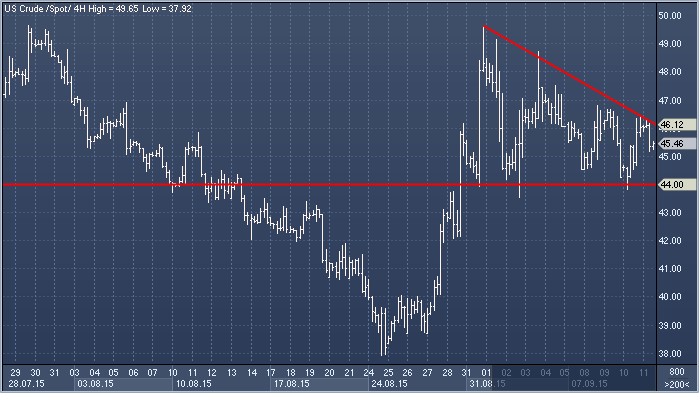 В пятницу нефть дешевеет, но котировки WTI и Brent пока остаются в рамках консолидационных треугольников. Нефть снижается на фоне некоторой слабости доллара, что, видимо, является следствием вчерашнего одобрения американским Сенатом сделки с Ираном. Вечером Baker Hughes опубликует данные по количеству действующих в США буровых установок (прим. ProFinance.ru: на позапрошлой неделе оно впервые за предыдущие семь периодов снизилось на 13 штук). Goldman Sachs присоединился к целой плеяде своих коллег, понизив прогноз по ценам на WTI и Brent на следующий год, а объем дневной добычи ОПЕК сократился в августе на 220 000 баррелей. По прогнозам организации, дневной спрос на ее нефть в следующем году вырастет на 1.6 миллиона баррелей, благодаря ожидаемому резкому снижению добычи за пределами ОПЕК. В августе (пятый месяц подряд) запасы в странах ОЭСР выросли на 18 миллионов баррелей. Источник: ProFinance.Ru - Новости рынка Forex