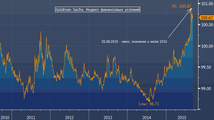 По мнению аналитиков Goldman Sachs, этого достаточно для того, чтобы убедить ФРС ничего не предпринимать хотя бы до декабря. Политики из Федеральной резервной системы могут пропустить ход на следующей неделе, если решат, что рынок уже сделал за них всю работу. Масштабные распродажи на фондовом рынке, рост стоимости кредитования в корпоративном секторе и укрепление курса доллара способствуют ужесточению финансовых условий на уровне, эквивалентном трехкратному повышению ставки по федеральным фондам по 25 базисных пунктов. Рассчитываемый Goldman Sachs индекс финансовых условий (Goldman Sachs Financial Conditions Index) - показатель, учитывающий такие переменные, как стоимость акций, кредитные спреды, процентные ставки и валютный курс - в конце августа, на фоне стремительного и глубокого падения на рынках, достиг максимальных значений за последние пять лет.