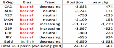 Как следует из последних данных CFTC, за неделю до 8 сентября спекулянты серьезно перетряхнули свои портфели, однако на объеме чистой длинной позиции по доллару против основных валют это мало сказалось. Ее объем вырос лишь на $0.6 млрд до $24.9 млрд, все еще оставаясь, таким образом, примерно, на 50% ниже максимальных значений последних месяцев. Как выяснилось, рост волатильности снизил привлекательность американской валюты. Чистая короткая позиций по евро (+$1.8 млрд до $11.4 млрд), объем которой, даже оставаясь неподалеку от минимальных за последний год значений, все еще составляет наибольшую часть бычьих ставок на доллар. После евро наиболее медвежий спекулятивный настрой наблюдается по аусси (-$3.7 млрд) и луни (-$3.68 млрд). Самой непопулярной валютой остается иена. Позиционирование по ней наиболее нейтрально среди основных валют (объем чистой короткой позиции составляет всего $0.7 млрд). Как ни странно, это имеет место быть на фоне роста спекуляций на тему того, что Банк Японии может принять новые стимулирующие меры уже в следующем месяце. В приведенной ниже таблице указаны валюта, спекулятивный настрой, динамика изменения объема спекулятивной позиции, сам объем и его недельное изменение. Источник: ProFinance.Ru - Новости рынка Forex