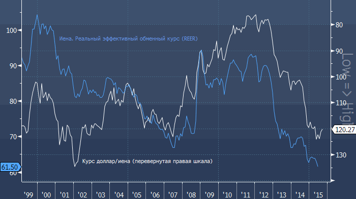 Два с половиной года назад стартовал амбициозный проект Премьер министра, получивший в народе название «Абэномика». За это время иена сильно подешевела: в конце 2012 года за один доллар давали 80 иен, а сейчас нужно не меньше 120. Реальный эффективный курс идет по тому же пути. По оценкам агентства Bloomberg, равновесная ставка указывает та то, что в третьем квартале 2012 года иена была переоценена на 15%, а во втором квартале 2014 года - недооценена на 10%.
