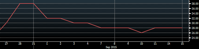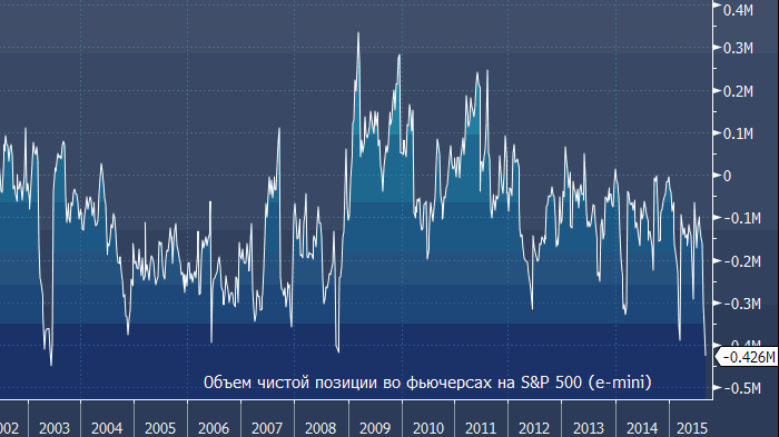 Что касается вчерашнего роста фондовых индексов, то его можно объяснить резким ростом медвежьих настроений с июля, вследствие чего совокупная чистая короткая позиция по фьючерсам на S&P 500 выросла на 315 000 контрактов до 426 000 контрактов (исторический рекорд, выше, чем на минимумах рынка в 2003 и 2008 годах, причем, спекулянты и «real money» делят этот объем, примерно, пополам). И за пару дней до такого важного события, как решение по ставкам FOMC, просто грех было не воспользоваться подобным экстремальным медвежьим настроем участников рынка и не высадить часть медведей, вынудив их закрыть хотя бы часть коротких позиций.