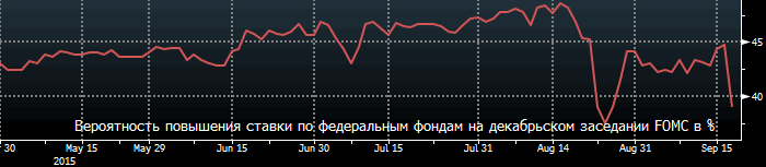 Прим. ProFinance.ru: на настоящий момент рынок фьючерсов на ставку учитывает в котировках 39-процентную вероятность повышения ставки по федеральным фондам на декабрьском заседании FOMC. Источник: ProFinance.Ru - Новости рынка Forex
