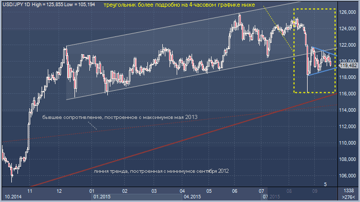 Курс доллар/иена находится в сильном бычьем тренде с осени 2012 года, когда Банк Японии объявил священную войну инфляции и встал на путь монетарного стимулирования. На представленном ниже графике дневного периода линия тренда с минимумов сентября 2012 года обозначена красным цветом и имеет текущее значение в области уровня 116.00.