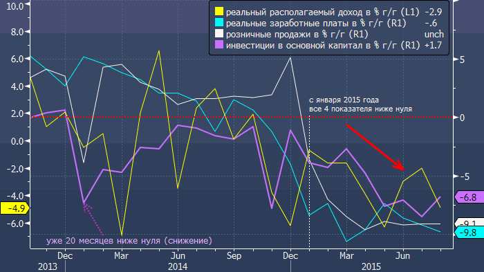 Реальный располагаемый доход в августе 2015 года сократился на 4.9% (к августу 2014) по сравнению с падением на 2.0% (к июлю 2014) в июле