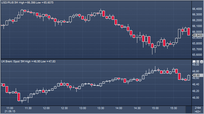 Весьма активный рост нефти придал импульс российской валюте, которая в паре с долларом достигла уровней вблизи 65.66 и 73.86 в паре с евро. К настоящему времени рубль немного сдал позиции на фоне фиксации прибыли, однако настрой остается позитивным, а приступы слабости, вероятно, привлекут свежий интерес к покупке. Улучшение динамики рубля и нефти может побудить российские компании поспешить с продажей валютной выручки, и в краткосрочной перспектив рост рубля имеет неплохие шансы на развитие. Подобной точки зрения, в частности, придерживаются и валютные стратеги Deutsche Bank. Они отмечают, что между рублем и нефтью сохраняется очень высокая корреляция, и, учитывая потенциал для некоторого восстановления нефти (прим. profinance.ru: в DB прогнозируют восстановление нефти брент к $53 за баррель в четвертом квартале), улучшения динамики стоит ожидать и от российской валюты, несмотря на рецессию в экономике. Источник: ProFinance.Ru - Новости рынка Forex